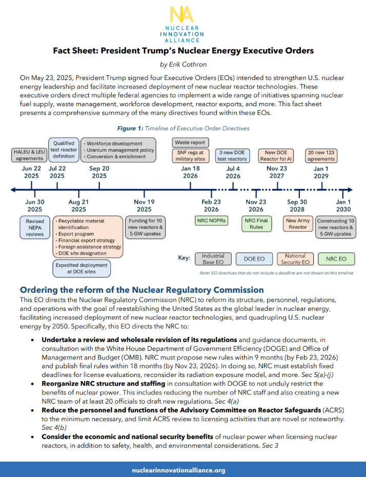 This NIA factsheet highlights the expected timeline of the NRC Executive Order 14300 Rulemaking. This timeline helps to provide a quick view of the individual rulemakings populated from the NRC website.